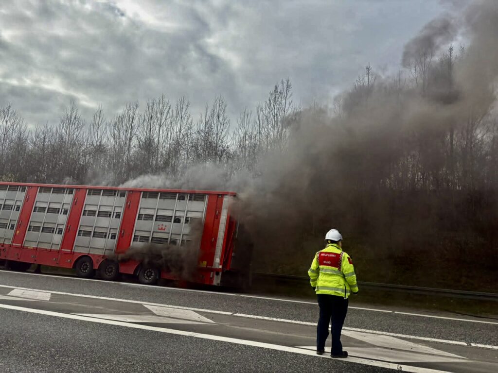 Branden skaber kø i området, og der udspiller sig voldsomme scener ved motorvejen. Der skal fortsat være levende dyr i vognen, mens både røg og flammer står ud fra køretøjet.